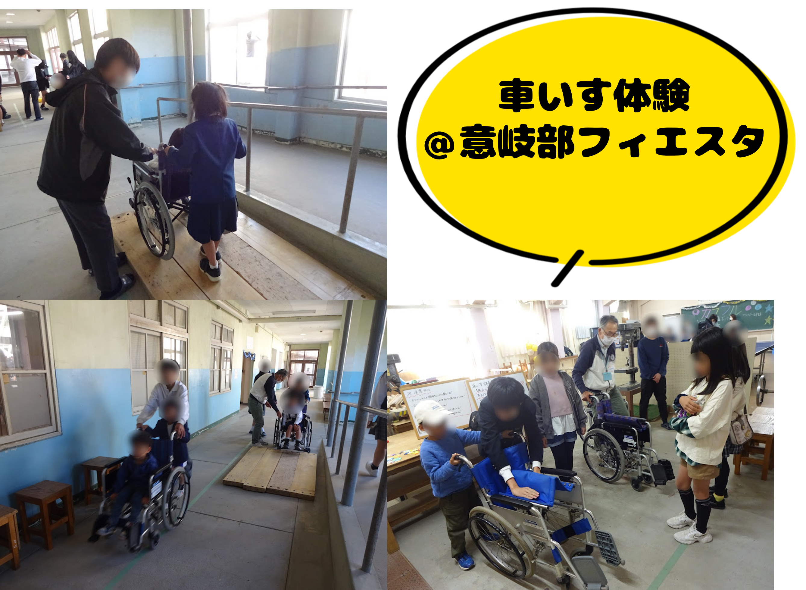11/15意岐部フィエスタ(場所:意岐部中学校)にて、特設クラブ「カラフル」のメンバーが来場者の方々に車いす体験を実施しました。この特設クラブは「障害」や「差別」について考える活動をしており、生徒たちの発案で初めて車いす体験をすることになりました。普段福祉教育に携わる事業所やボランティアの方から事前レクチャーをしっかりと受けていたこともあり、最初は緊張した様子でしたが徐々に慣れていき、来てくれた子どもたちにしっかりと車いすについて教えてくれていました。終了後には「楽しくすることができた!」と充実感を感じている様子でした(*^-^*)
