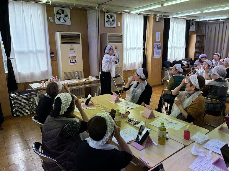 楠根校区福祉委員会は介護予防講座の一環として資生堂の方を講師にお招きし、美容を通じたフレイル予防講座を実施しました。内容としては年齢を重ねても化粧を楽しみ、積極的に社会参画しようというコンセプトのもと、口腔ケアなども交えながら簡単に続けられるメイクアップ術を教えていただきました。参加者の方からは「久しぶりにちゃんと化粧したわ〜」「きれいになれて楽しかった〜」といった感想が聞かれ、来た時とは違ういきいきとした表情をされており、化粧の持つ力を実感しました。