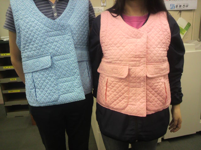 前回、小学生に高齢者の気持ちを理解してもらうために、疑似体験グッズの見本を作っていただきました。今回は、見本のベストが大変好評で、あと3着お願いしたところ快くお忙しい中作っていただきました。子供たちが少々乱暴に扱っても大丈夫なように、また体型も融通が利くようにと工夫が一杯詰まったベストです。ありがとうございます。