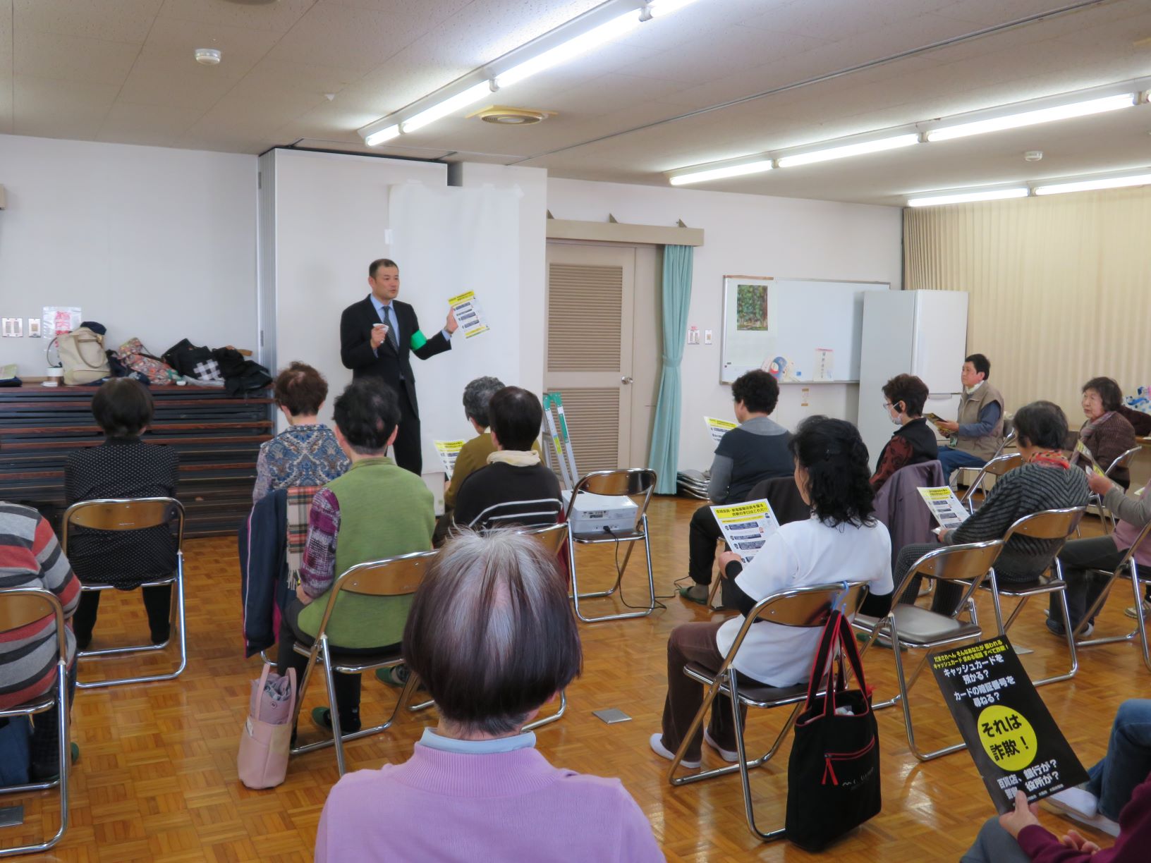 地域包括支援センター社協荒川は毎週第1木曜日、長瀬北公民分館にて介護予防「スマイル」を開催しています。平成31年4月4日(木)は布施警察の方に、特殊詐欺被害防止についてお話して頂きました。最近は新元号が令和になることを利用して個人情報を聞き出す詐欺が流行っているらしいです。怖いですね。犯人はあらゆる手口を使い、近づいてくるので気を付けましょう!