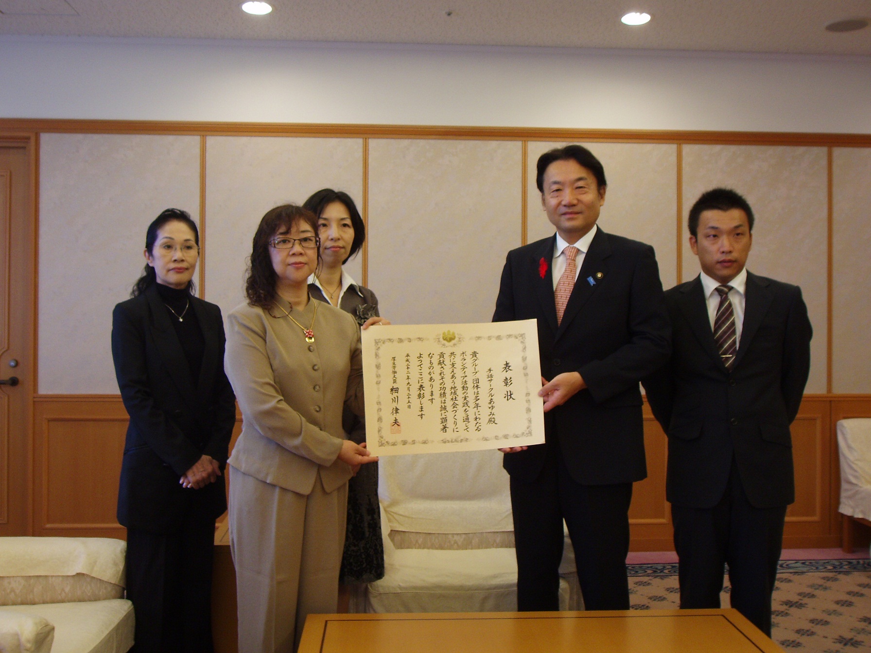 【手話サークルあゆみ】は、昭和60年発足以来、手話の学習や聴覚障がい者との交流など、福祉の向上のために率先して実行してこられ、ボランティア活動の理解と積極的な参加の促進に多大な功績をあげ、この度『第22年度 ボランティア功労者に対する厚生労働大臣表彰者』に選ばれました。