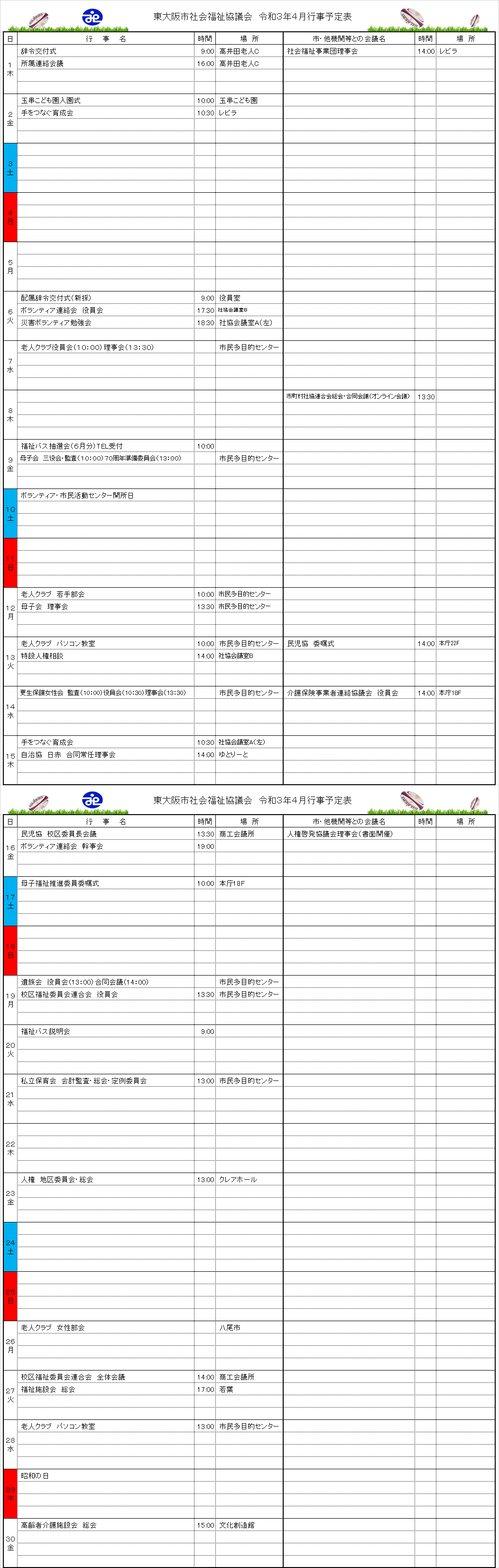 月間行事予定表