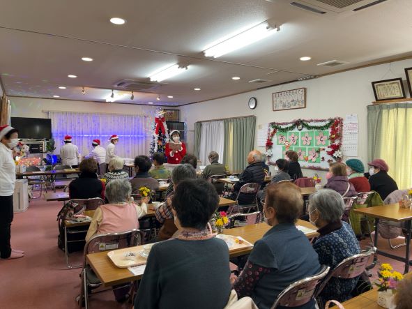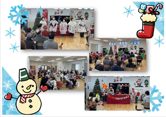 今年は初めて、午前は子ども午後は高齢者を対象にそれぞれ開催されました。会場はクリスマス色に彩られ、民生委員の方々が披露される聖歌隊や人形劇、ゲストによるペンシルバルーン(かじかじ風船クラブ)や演芸(いっぺん笑おう会)など内容盛りだくさんで、大人も子どももたくさん笑顔になる素敵な一日となりました☺