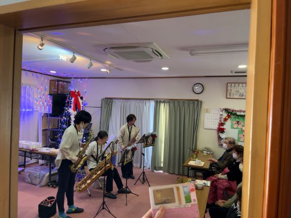 『サックスアンサンブル隊』をお招きして、楽しいひと時をすごしました。中盤で、♪もしもしカメよ カメさんよ〜♪という曲に合わせて脳トレを兼ねた体操をしました。