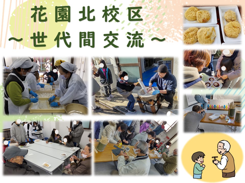 花園北校区で、世代間交流として餅つき大会と、昔遊びが行われました。