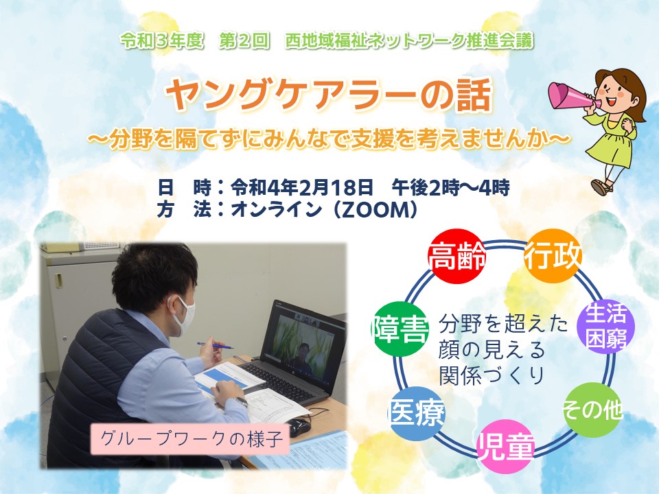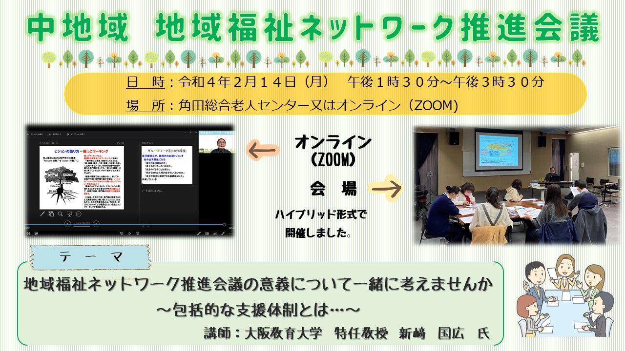 ÃæÃϰè¤Ç¤Ï¡¢º£Ç¯ÅÙÂ裲²óÌܤÎÃϰèÊ¡»ã¥Í¥Ã¥È¥ï¡¼¥¯¿ä¿Ê²ñµÄ¤ò£²·î£±£´Æü¡Ê·î¡Ë¤Ë³«ºÅ¤·¤Þ¤·¤¿¡£º£²ó¤â²ñ¾ì¤È¥ª¥ó¥é¥¤¥ó¡ÊZOOM¡Ë¤Î¥Ï¥¤¥Ö¥ê¥Ã¥É·Á¼°¤Ç¹Ô¤¤¡¢£´£²Ì¾¤ÎÍÍ¡¹¤ÊʬÌî¤ÎÊ¡»ãÀìÌ翦¤ÎÊý¤¬»²²Ã¤·¤Æ²¼¤µ¤¤¤Þ¤·¤¿¡£¹Ö»Õ¤È¤·¤Æ¡¢Âçºå¶µ°éÂç³Ø¡¡ÆÃǤ¶µ¼ø¡¡¡¡¿·ºê¹ñ¹»á¤ò¤ª¾·¤¤·¤Æ¡ØÃϰèÊ¡»ã¥Í¥Ã¥È¥ï¡¼¥¯¿ä¿Ê²ñµÄ¤Î°ÕµÁ¤Ë¤Ä¤¤¤Æ°ì½ï¤Ë¹Í¤¨¤Þ¤»¤ó¤«¡ÁÊñ³çŪ¤Ê»Ù±çÂÎÀ©¤È¤Ï¡Ä¡Á¡Ù¤ò¥Æ¡¼¥Þ¤ËÃϰèÊ¡»ã²ÝÂê¤Î¸½¾õ¤ä¿¿¦¼ïÏ¢·È¤Î½ÅÍ×ÀÅù¤ò¤ªÏä·¤ÆÄº¤¤Þ¤·¤¿¡£¹Ö±é¤ÎÅÓÃæ¤Ë¤Ï¥°¥ë¡¼¥×¥ï¡¼¥¯¤ò¼Â»Ü¤·¤Æ¡¢°Õ¸«¸ò´¹¤ò¹Ô¤¤²þ¤á¤Æ¡Ö´é¤Î¸«¤¨¤ë´Ø·¸¤Å¤¯¤ê¡×¤ÎÂçÀÚ¤µ¤òÃΤ뵡²ñ¤È¤Ê¤ê¤Þ¤·¤¿¡£