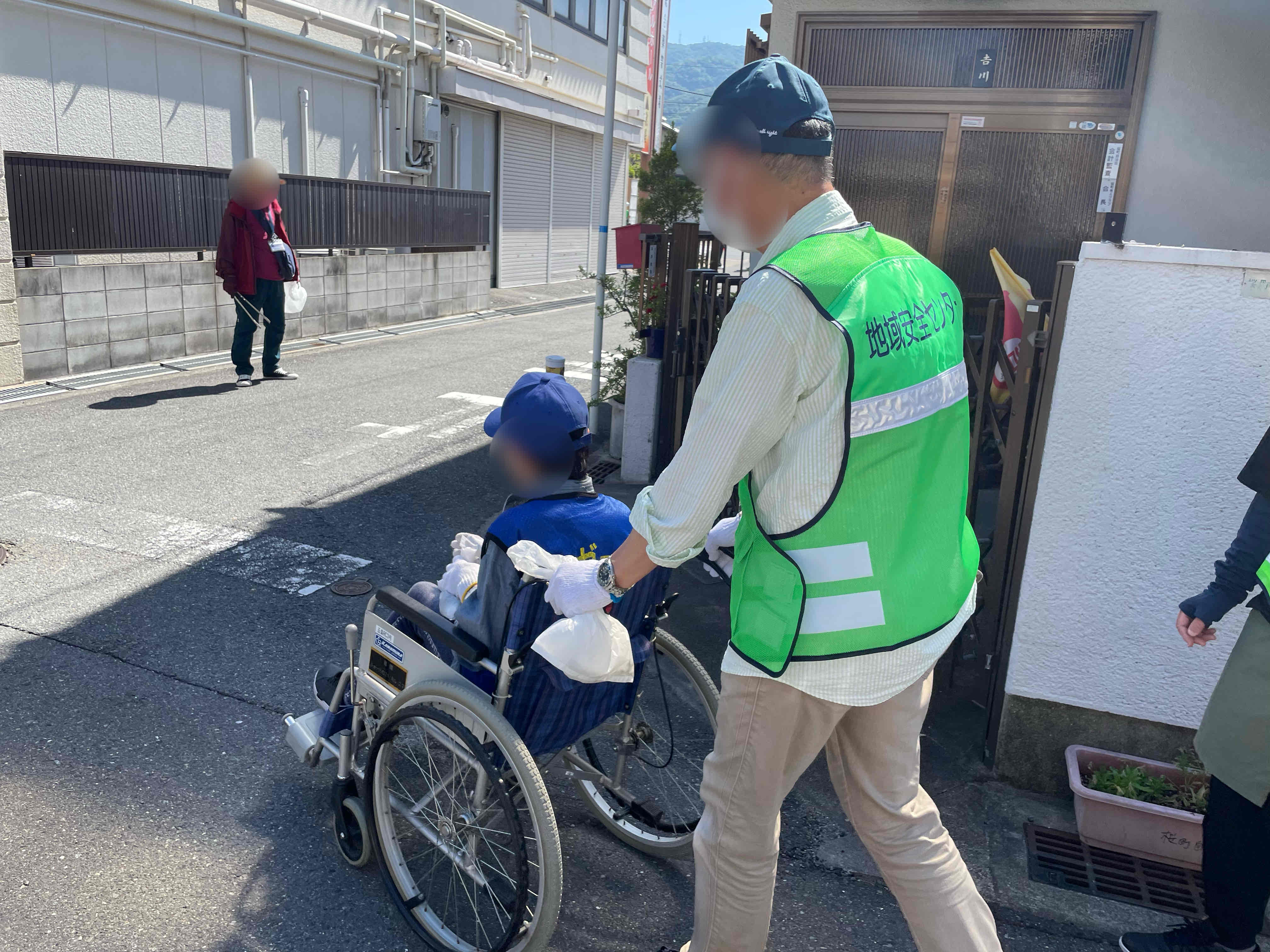 車椅子体験、ゴミ拾い、危険箇所を確認しながら縄手北中学校まで避難し、運動場でAEDや簡易担架作成や消火訓練、備蓄倉庫の確認や公衆電話体験をしました。