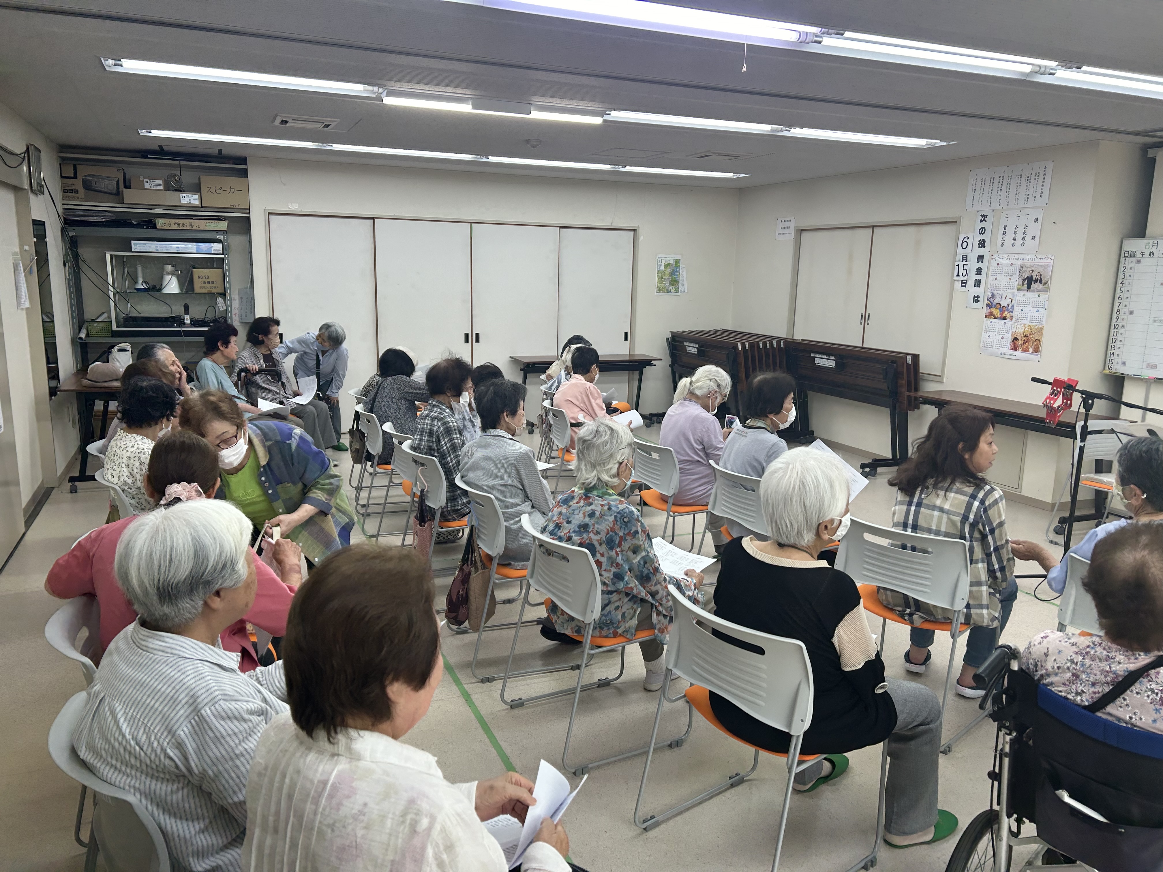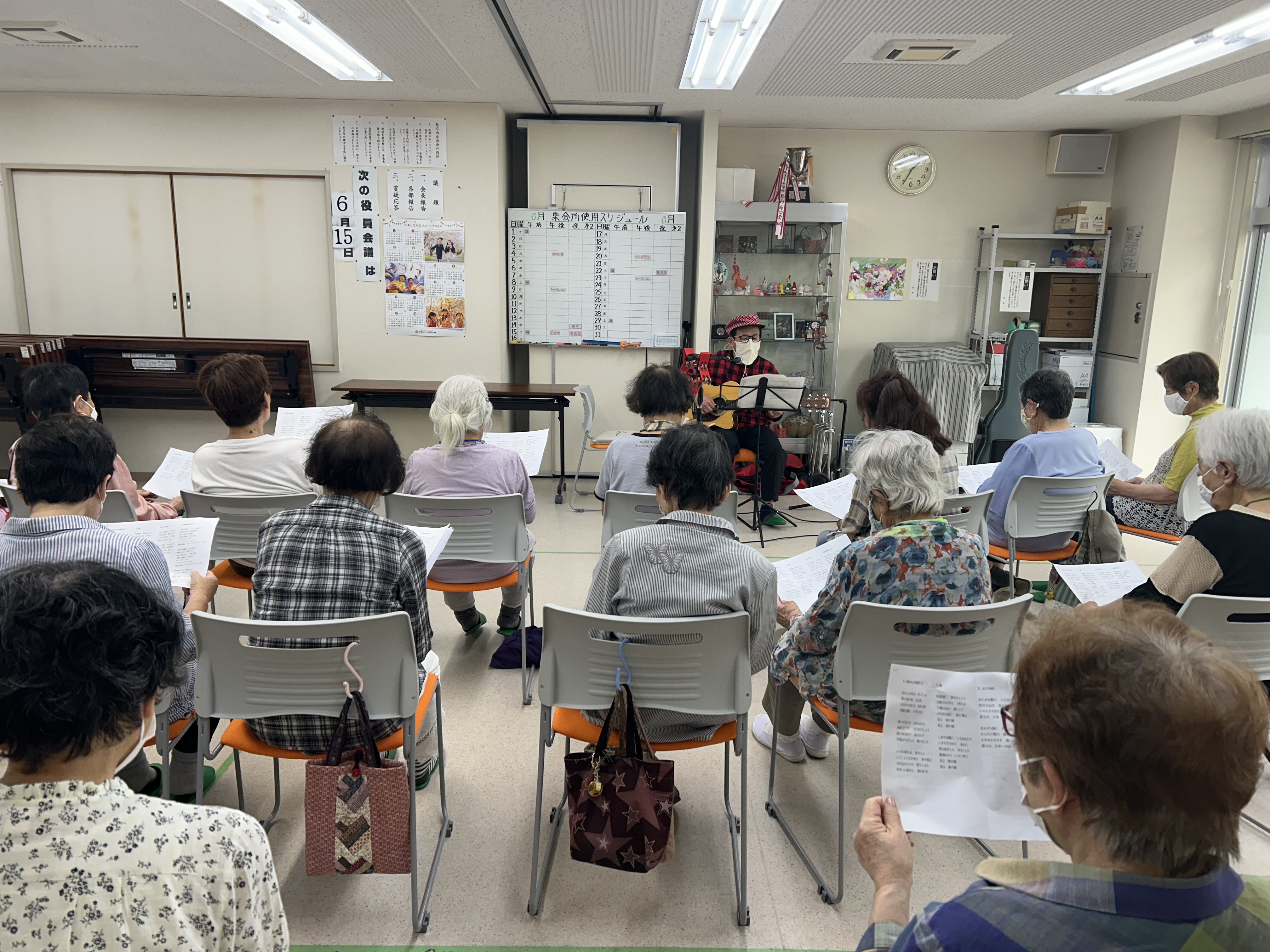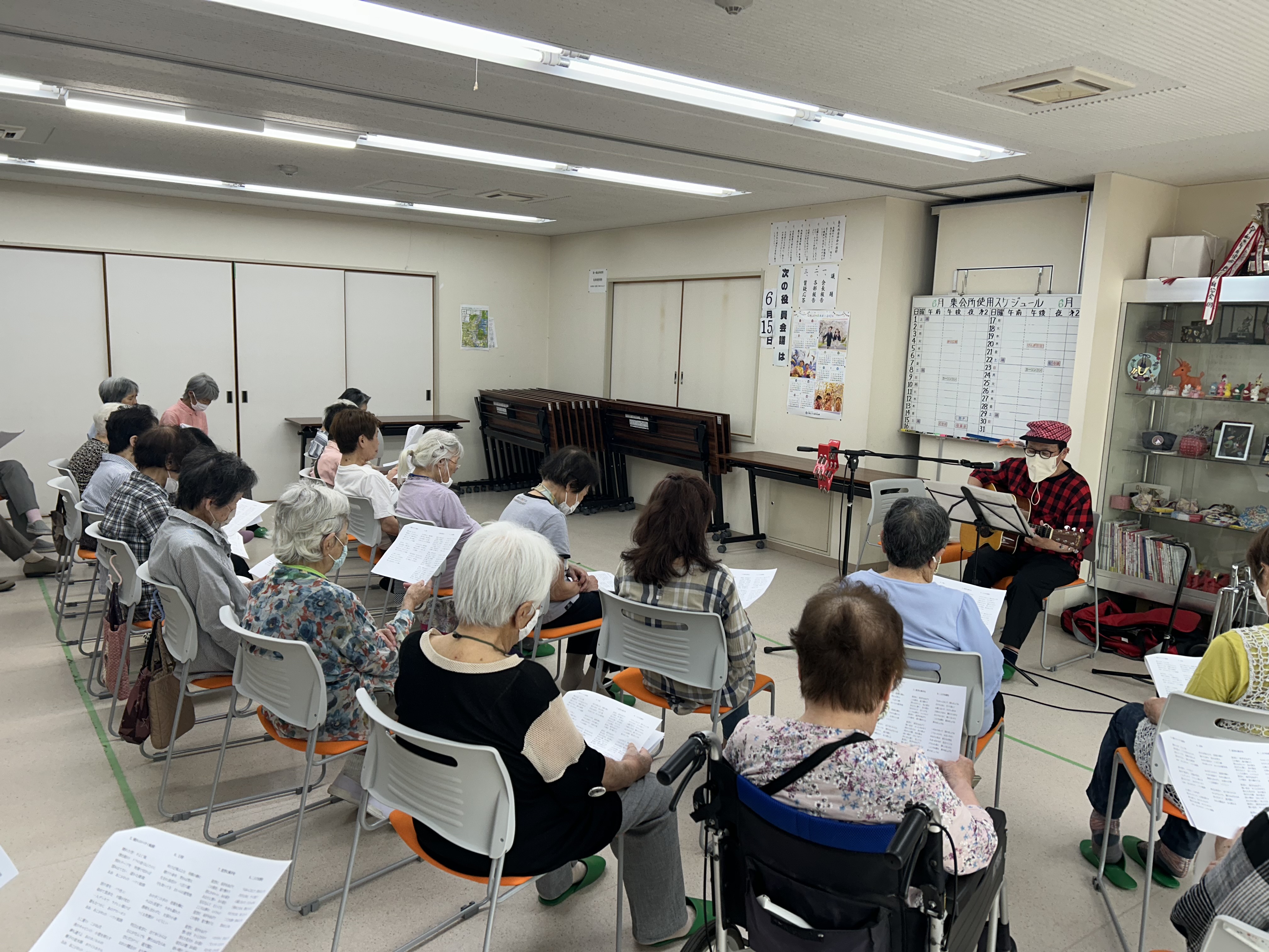 今月の「げんき教室」はゆっきんさんのギター生演奏に合わせて歌を歌いました♪みなさんこの日を楽しみにしており、たくさんの方が来てくださいました。おかげさまで集会所はほぼ満席(*^^)vとなりの席の方とお話しをしたり、歌を歌ったり、リクエストをしてみたり。みなさん楽しい時間を過ごしておられました。