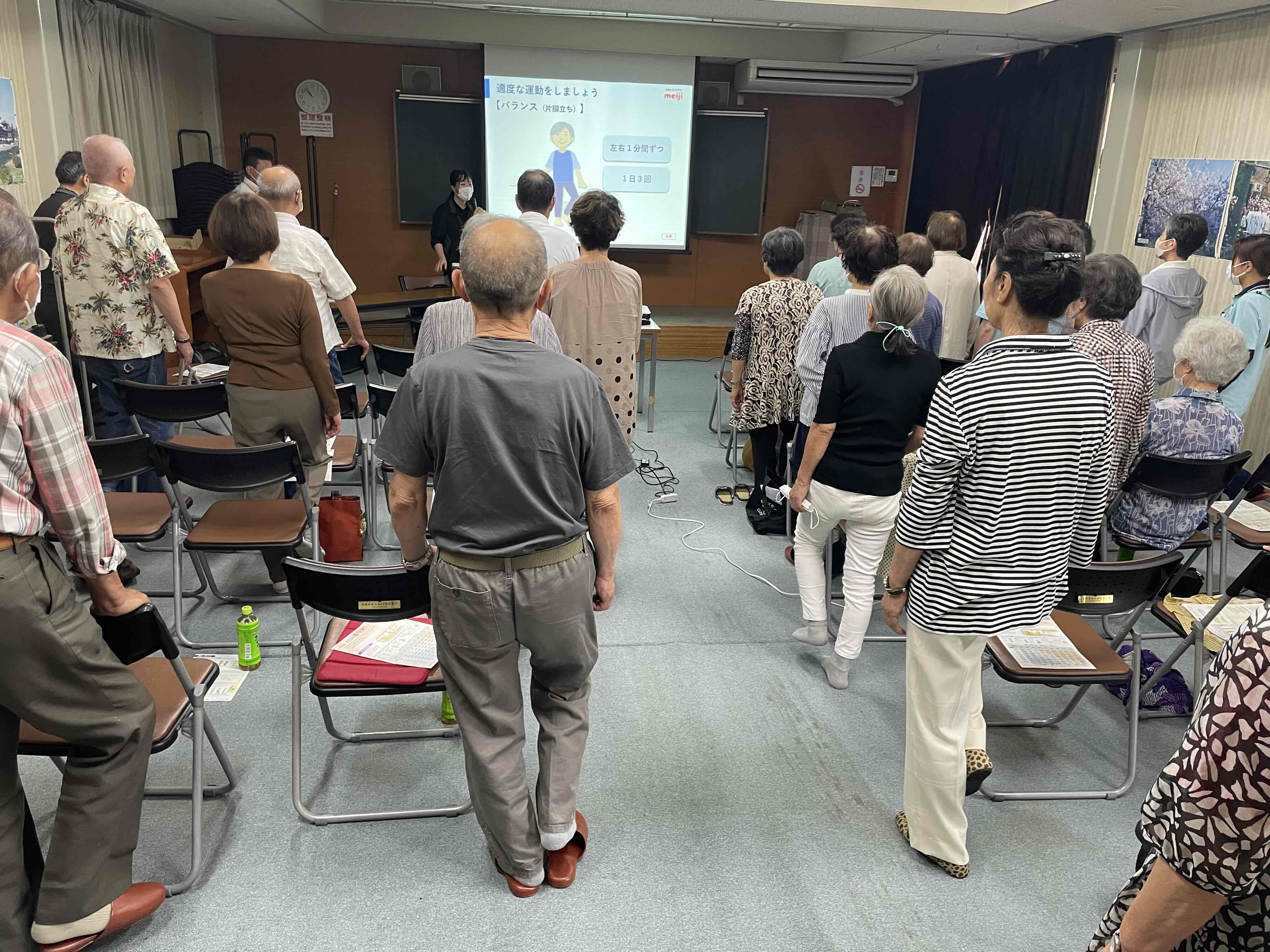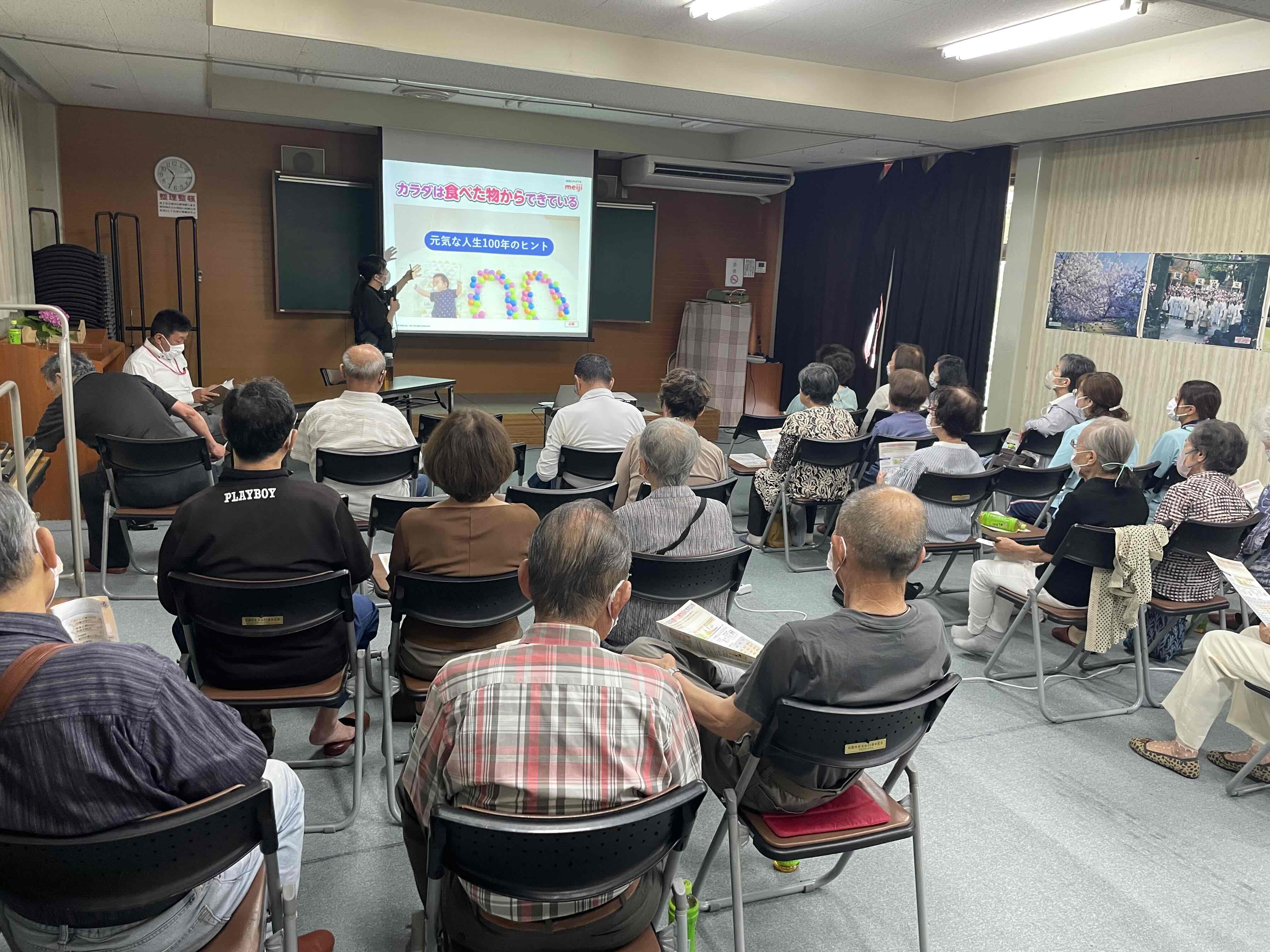 株式会社明治の栄養士さんに来ていただき、「カラダは食べた物からできている」というテーマのお話がありました。簡単な運動もあり、健康について満遍なく学べる講話でした★