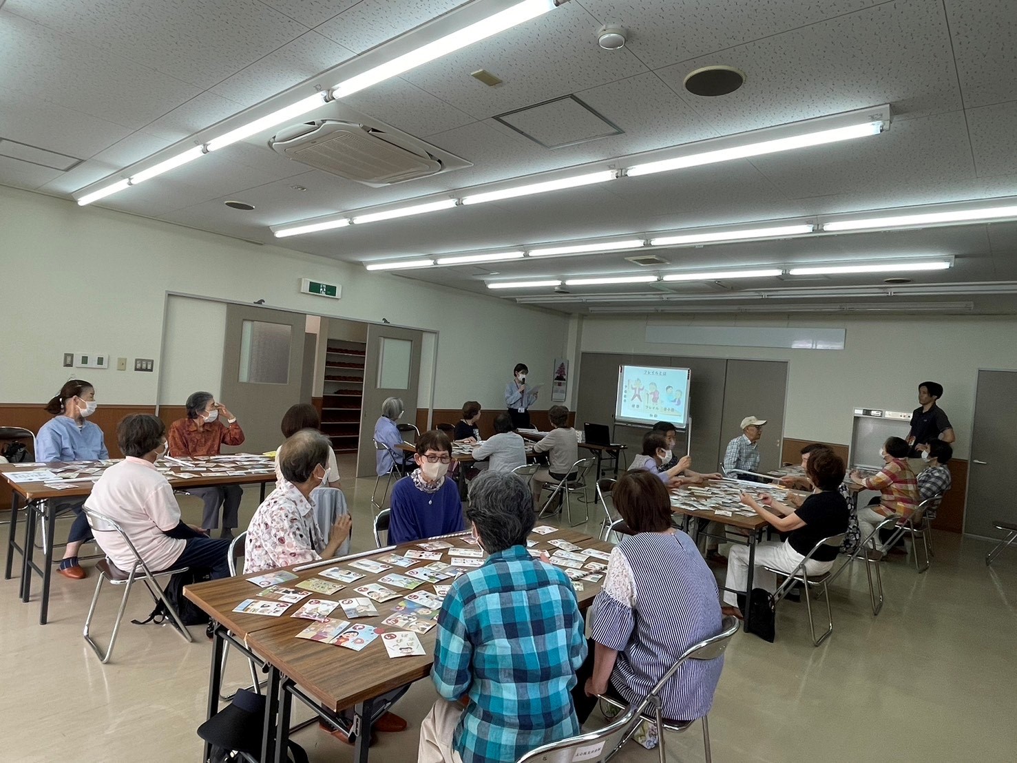 今月の「げんき教室」はゆっきんさんのギター生演奏に合わせて歌を歌いました♪みなさんこの日を楽しみにしており、たくさんの方が来てくださいました。おかげさまで集会所はほぼ満席(*^^)vとなりの席の方とお話しをしたり、歌を歌ったり、リクエストをしてみたり。みなさん楽しい時間を過ごしておられました。