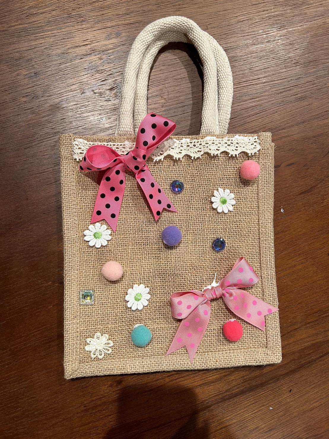 巷で流行りの無〇良品のバッグに協力員さんが準備してくださった可愛い飾りをつけてオリジナルバッグを作りました★