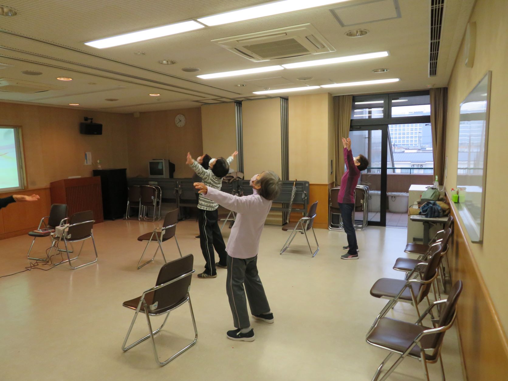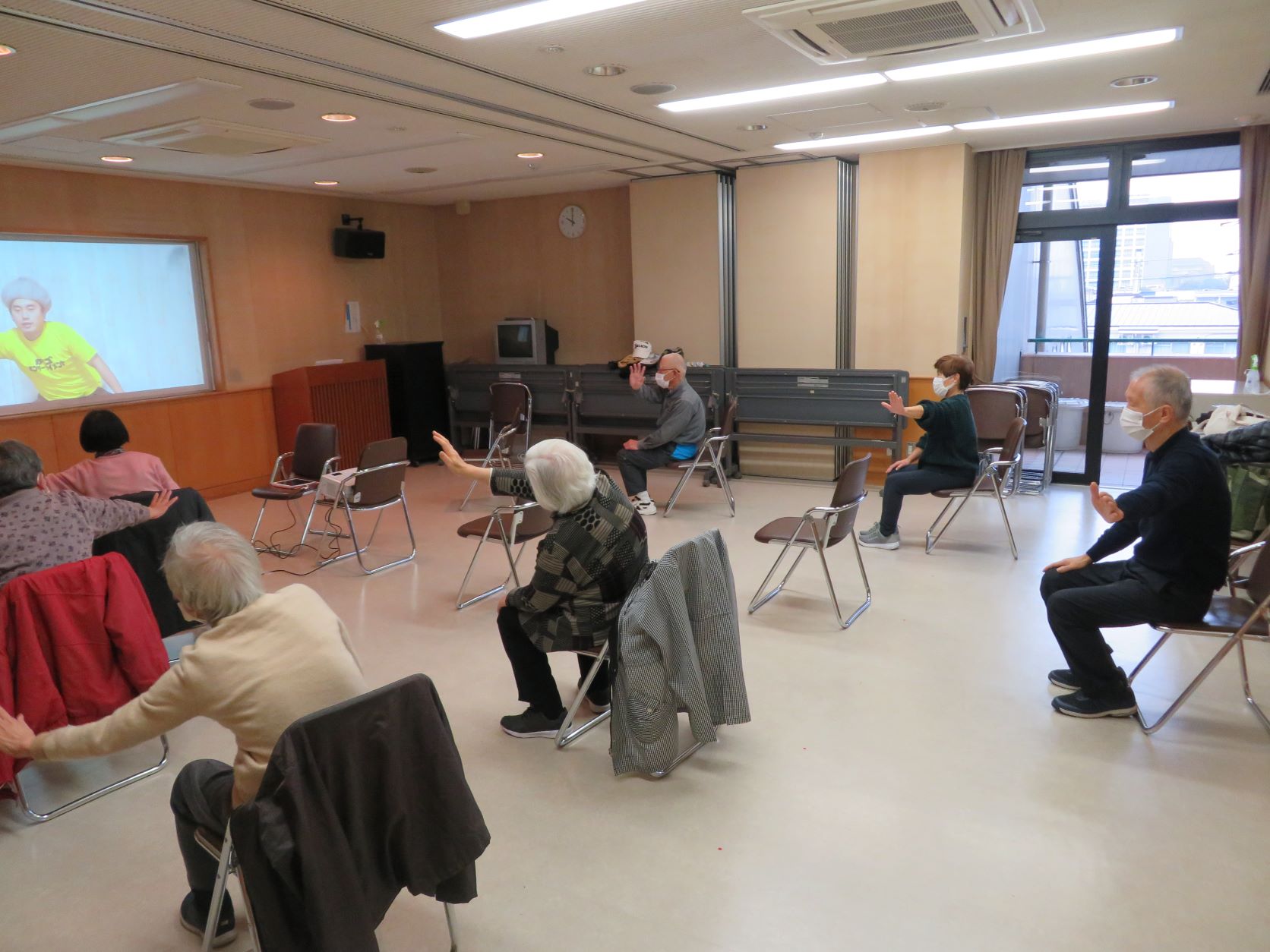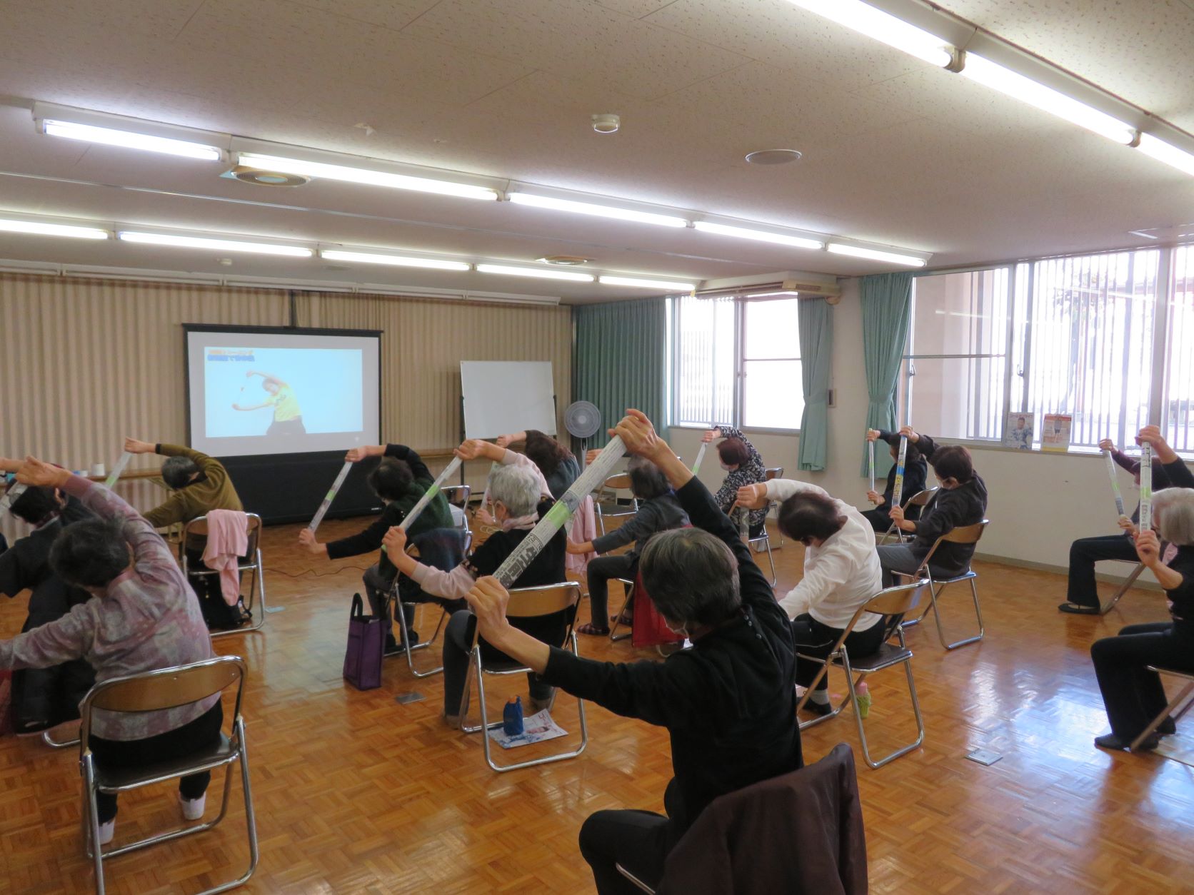 新型コロナウイルスの感染拡大に伴いネットワークやICTの導入が急速に普及してきましたが、介護予防教室にもこういった先進技術を積極的に活用していこうと考えています。その先駆けとして今回は、ネット動画を視聴しながら体操を実施しました。いつもと内容が違うことでフレッシュに取り組むことができたり、懐かしい音楽を簡単に聴くことができて心身ともに活性化できました!