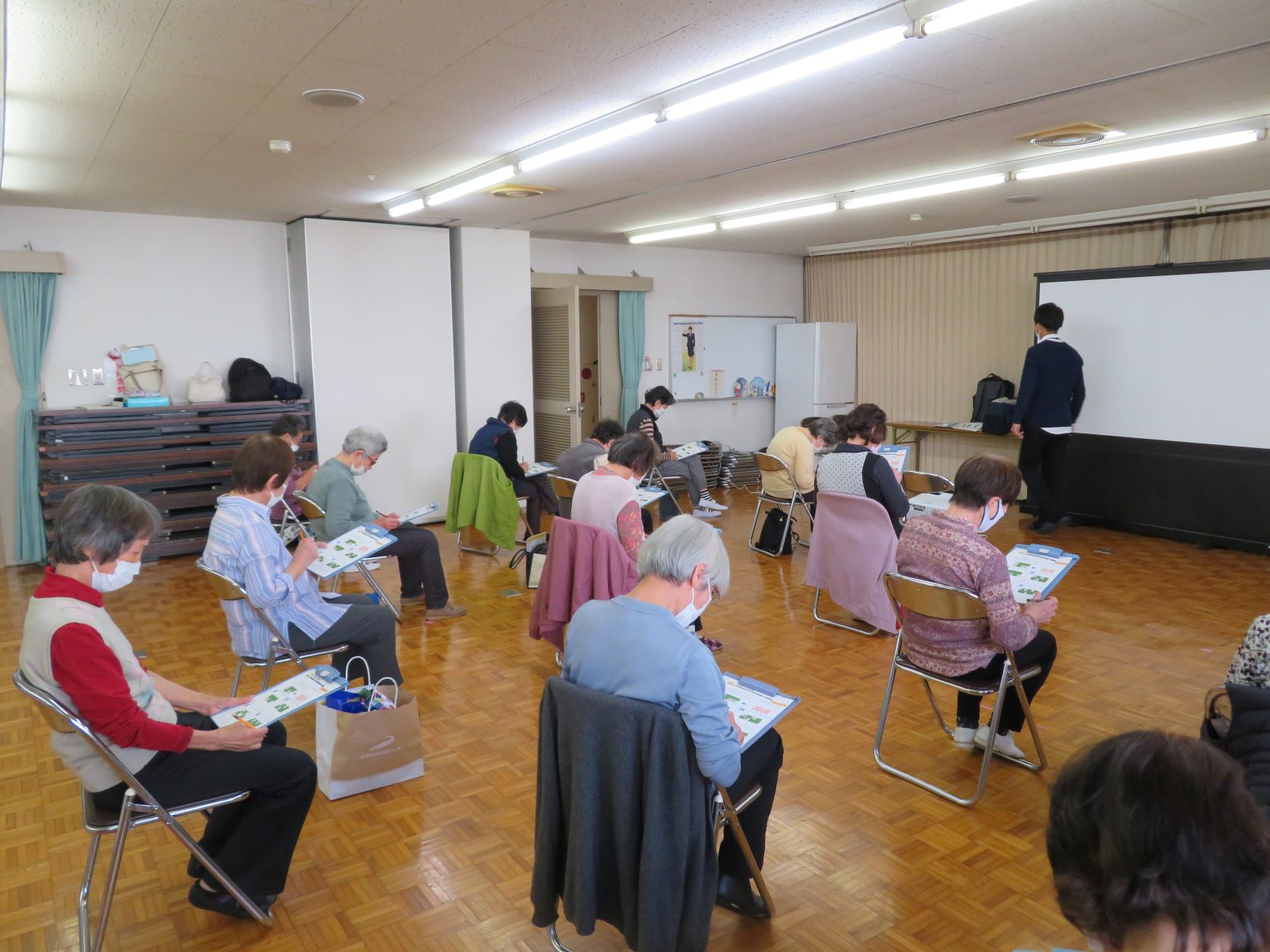 いつもは映像に合わせて身体を動かしながら脳トレに取り組むことが多いですが、今回はプリントを用いて個人で脳トレに臨んでいただきました。限られた時間で集中して取り組むという機会を介護予防教室で実施することで有意義な時間となりました。