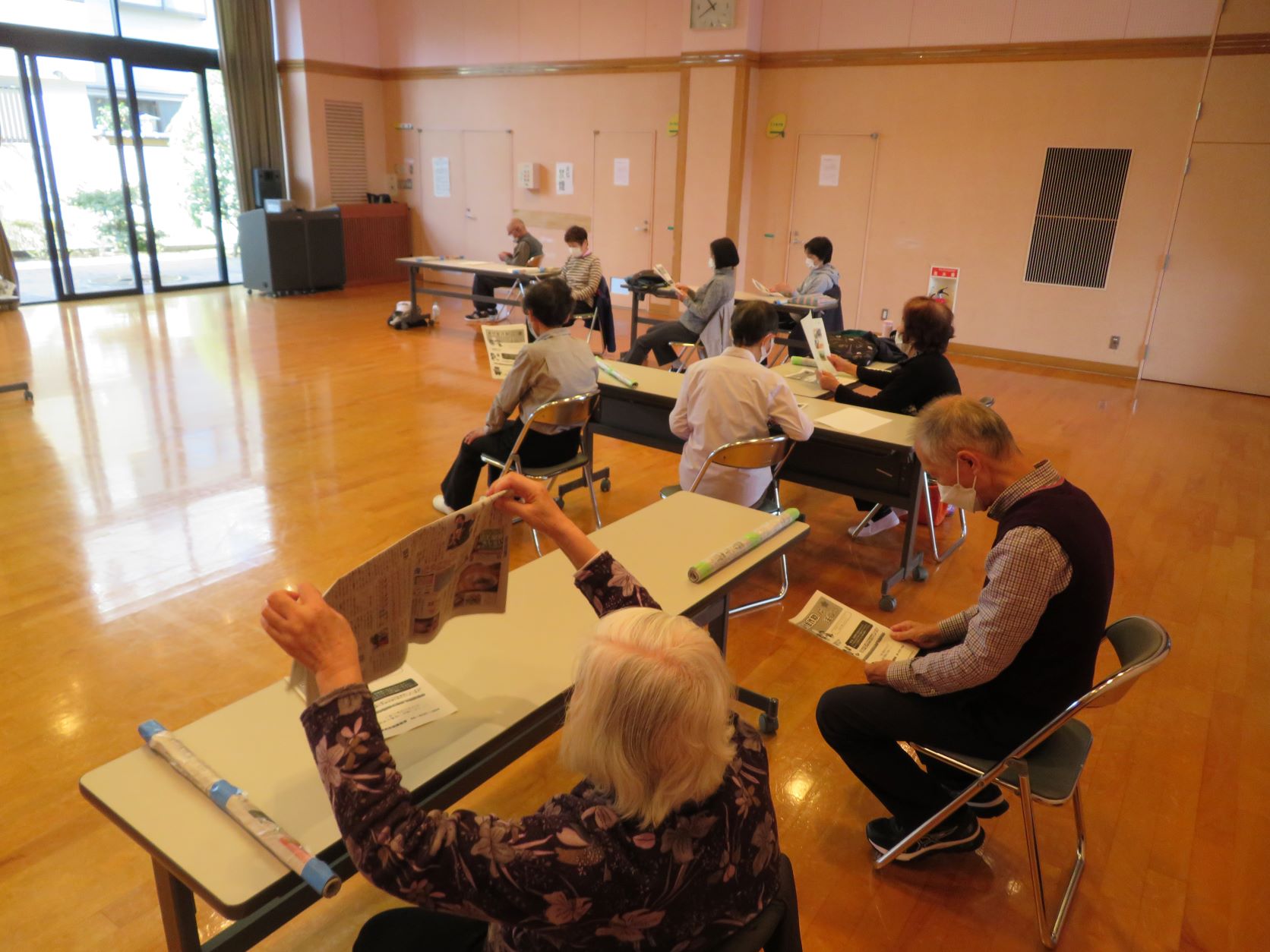 今回は「棒」を使用した棒体操に取り組みました。ストレッチを基本的な動作として、筋力・体幹トレーニングもできる万能な体操です。棒は新聞紙を巻くだけで簡単につくることができるので、参加者の皆さんには自作いただき体操で使用いただきました。「自宅でも簡単にできそうだから」と持ち帰りされる程、充実の内容となりました。