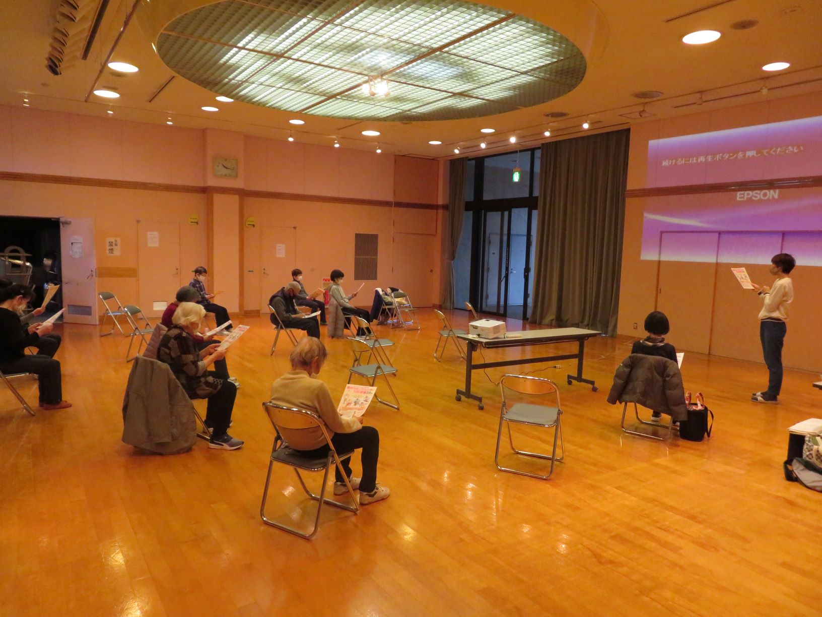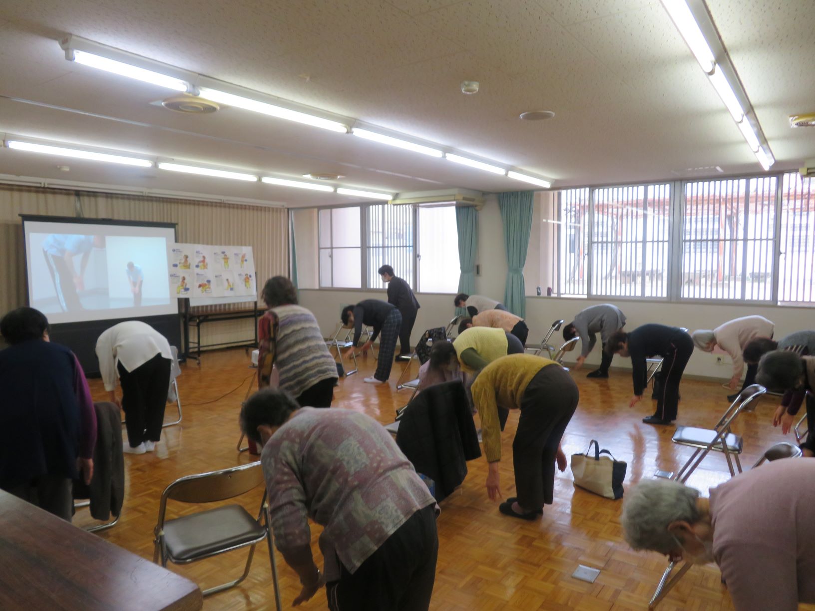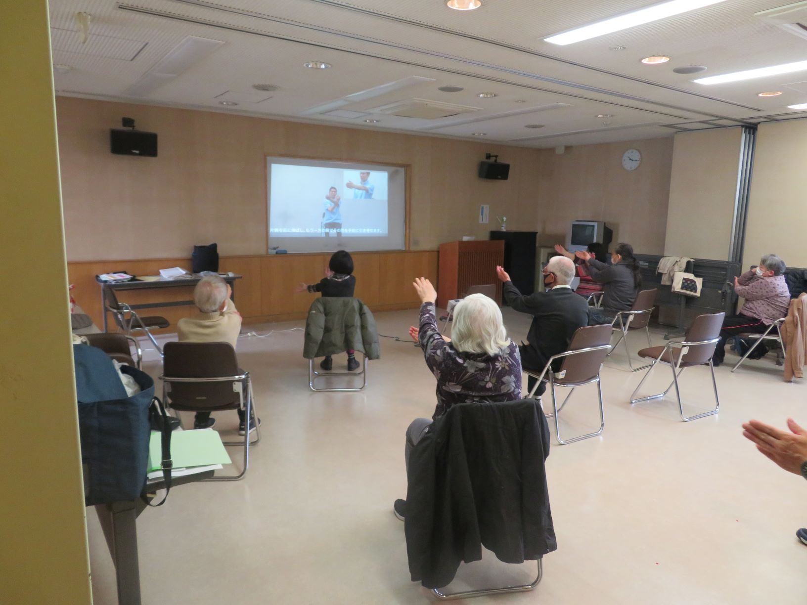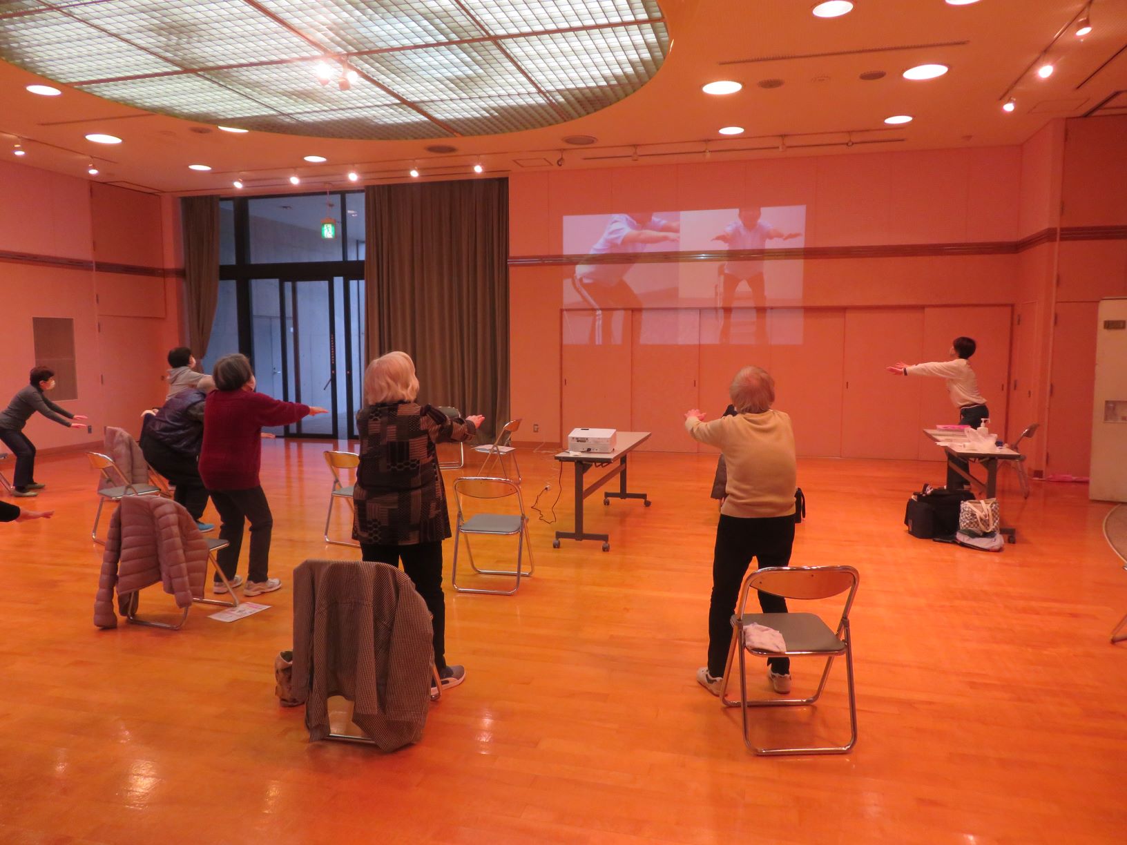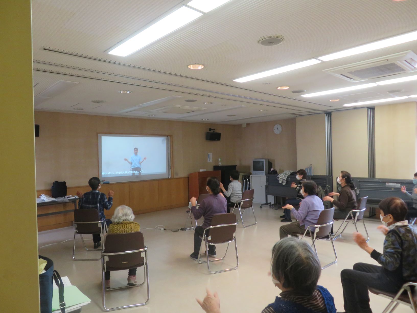 多目的ホールは広いため、映像も大きく映し出すことができ、手足を大きく伸ばし体操をすることができました。
