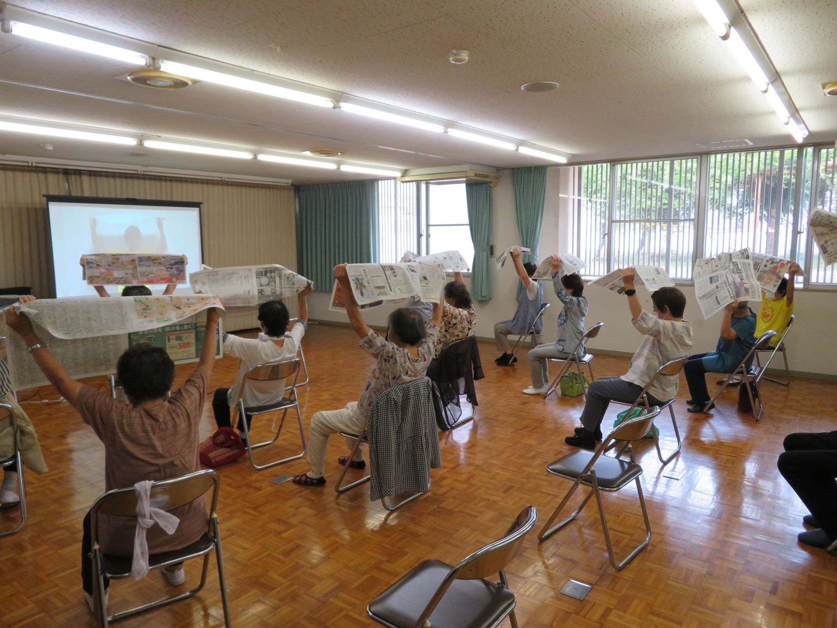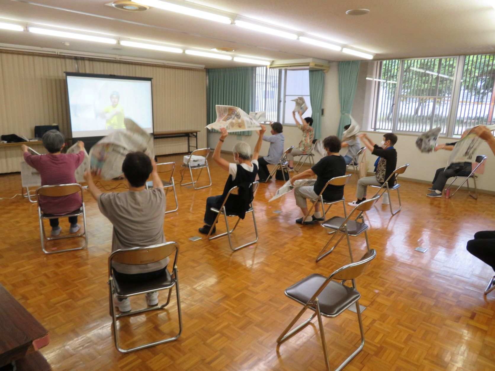 今回は新聞紙を使って映像を観ながら体操に取り組みました。普段の体操では動かし難い動きに取り組むことで、とても運動効果を実感できる有意義な時間になりました。