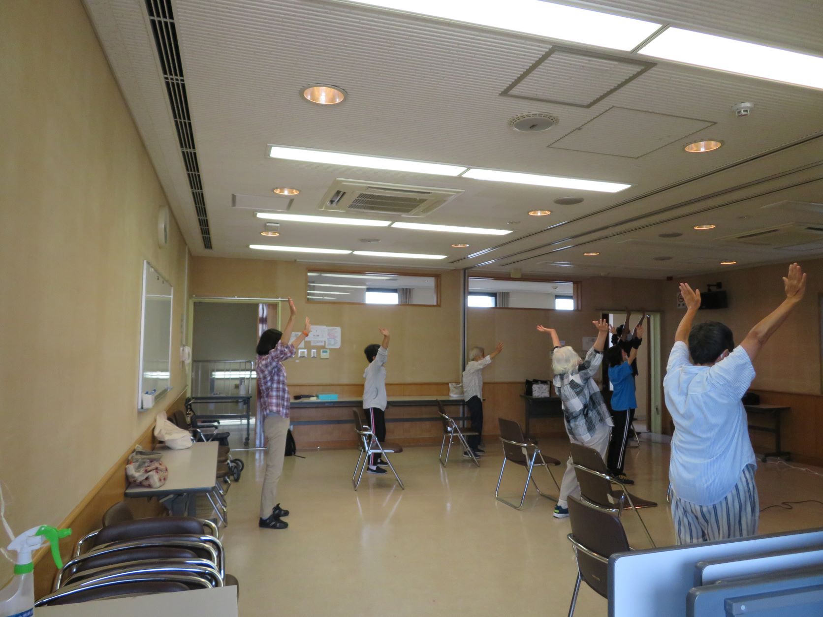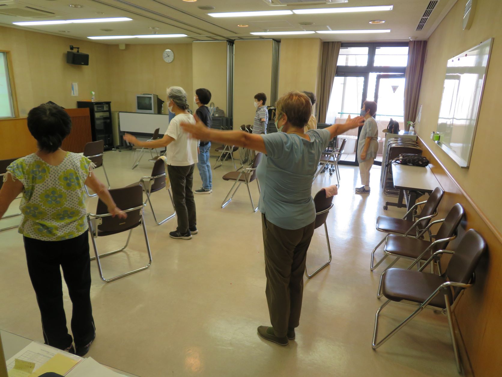 イスに座りながらの上半身や下半身の体操と、立って行う下半身の強化体操に取り組みました。残暑で外出がまだまだ億劫になりがちな季節なので運動不足にならないようにと皆さん元気に取り組まれていました!!