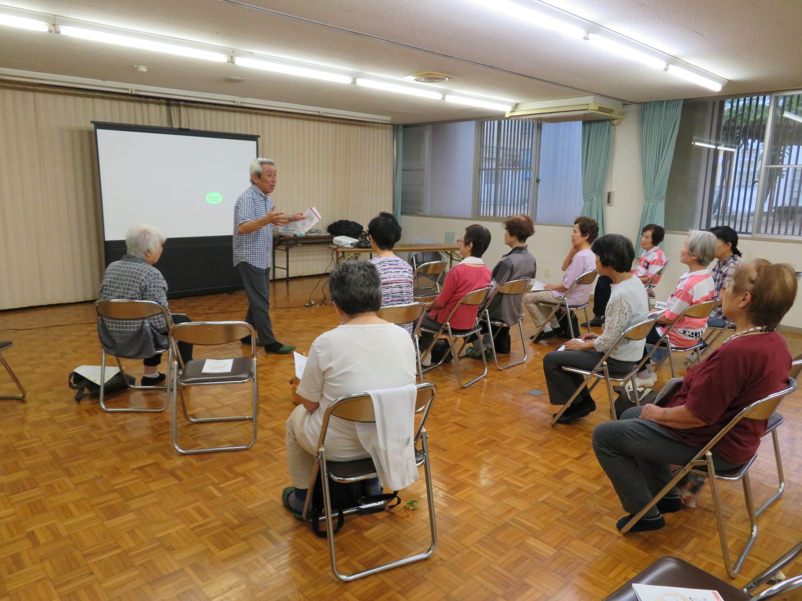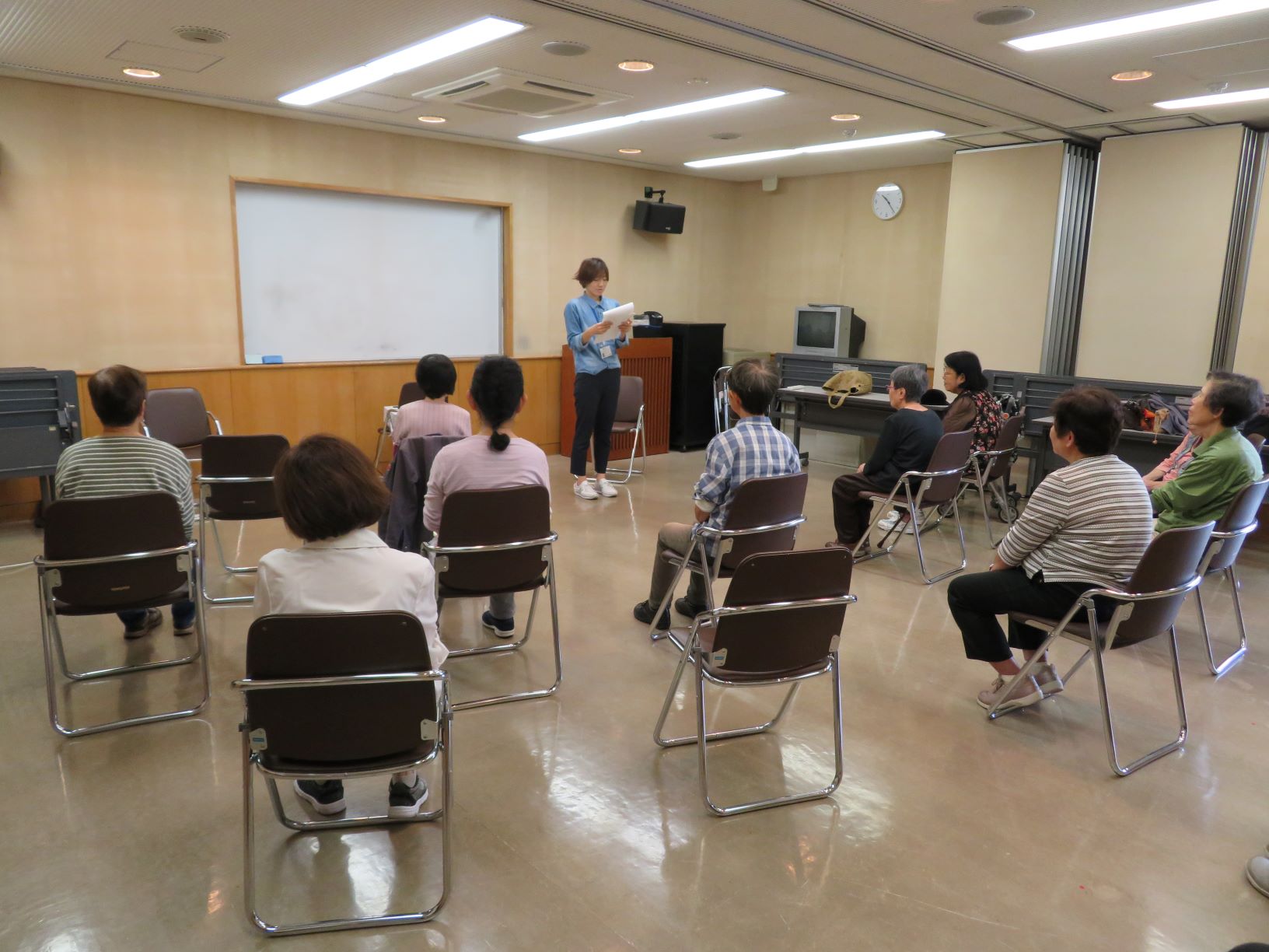 地域包括支援センター社協荒川は毎月第1木曜日、長瀬北公民分館にて介護予防教室「スマイル」を開催しています。令和元年10月3日(木)は理学療法士の先生に腰痛についてのお話と体操をしていただきました。腰痛に対しての考え方、運動する時の正しい姿勢や体の動かし方など、腰痛に関する役立つ情報が盛りだくさんの教室になりました!