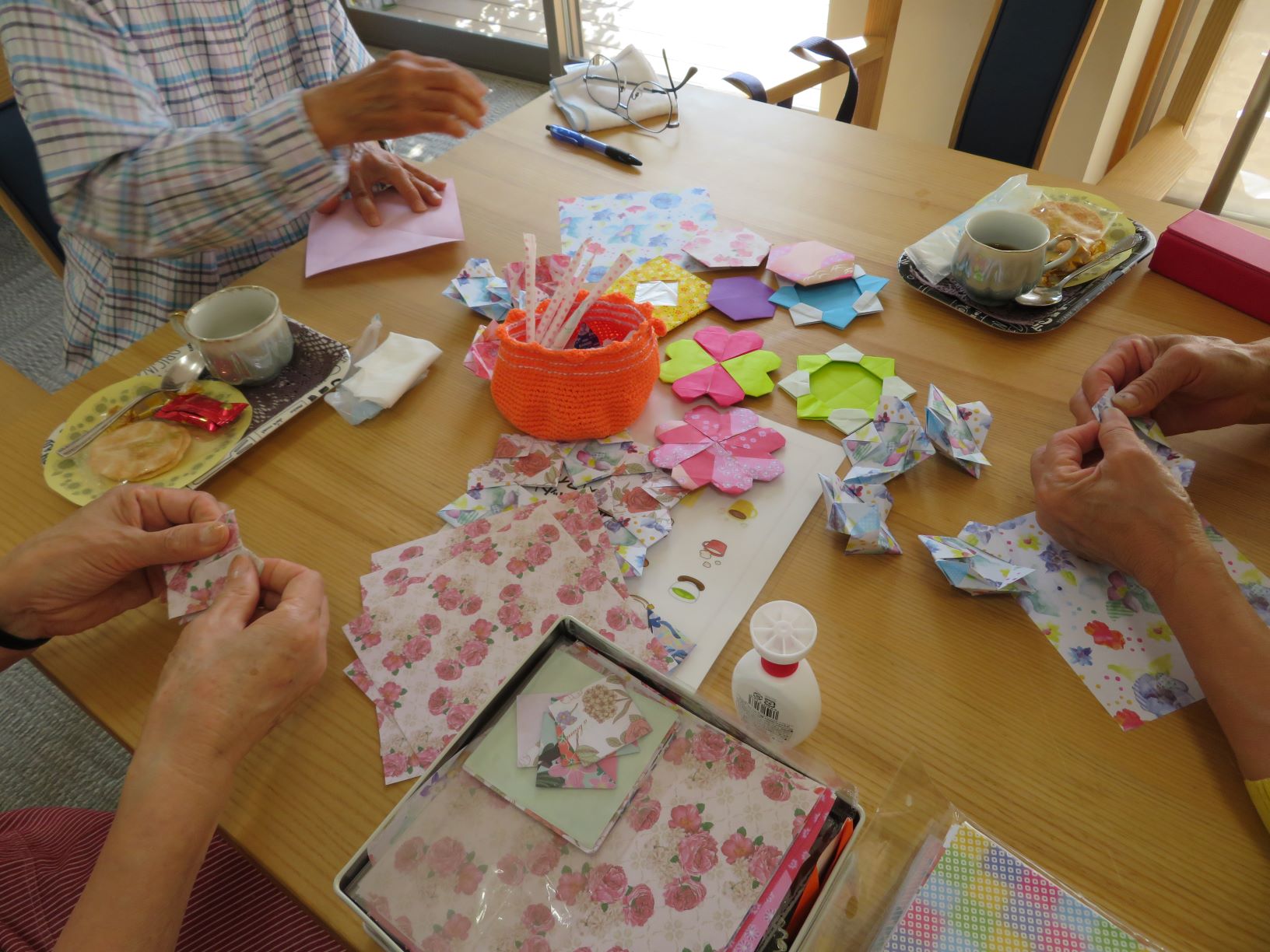 お茶を飲みながらおしゃべりしたり、今月は折り紙でリース作りやしおりを作って楽しく過ごしました。初めて参加された認知症の方もケアマネジャーやボランティアさんに見守られて笑顔で昔ばなしを披露されていました。11月はクリスマスリースを作ります。