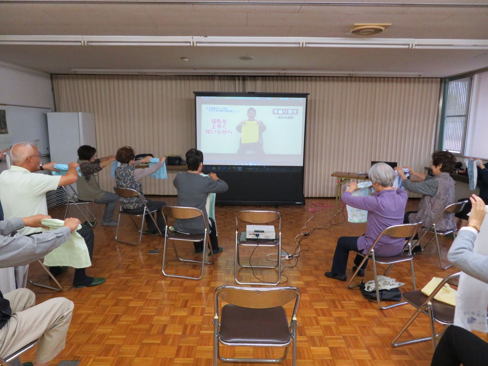 タオルを使った体操、口腔ケアのお話、そして近隣助け合い体験カードを行いました。