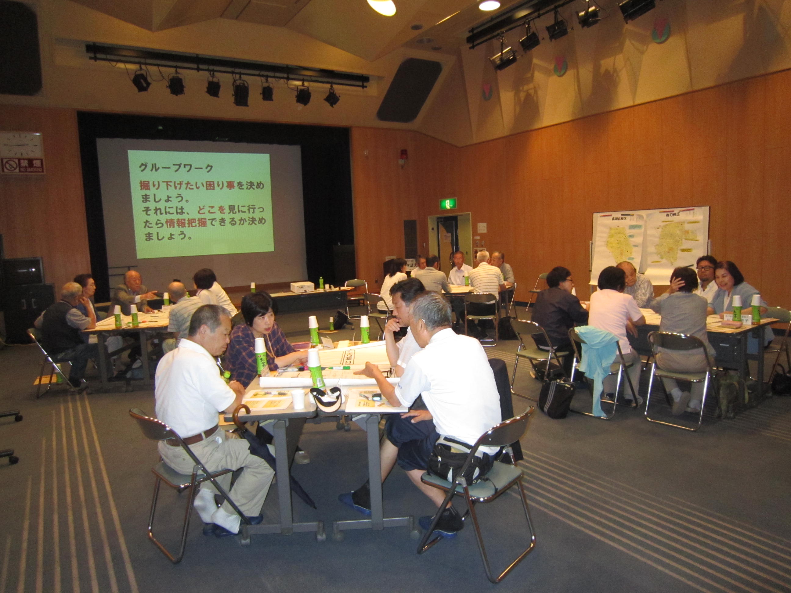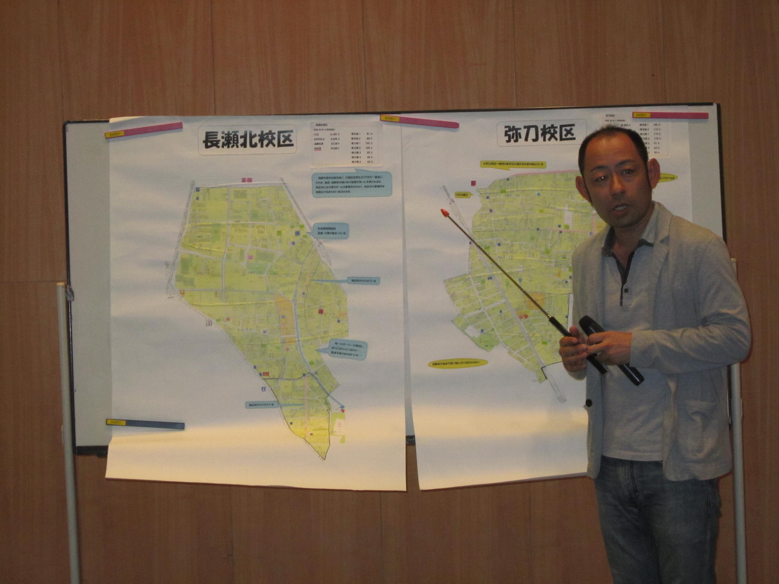 地域活動団体・医療機関・福祉介護の専門機関が参画し、昨年度作成した支えあいマップをもとに、高齢者の困りごと(買い物、通院、一人暮らしでの不安、集いの場など)を小学校区別に出し合いました。