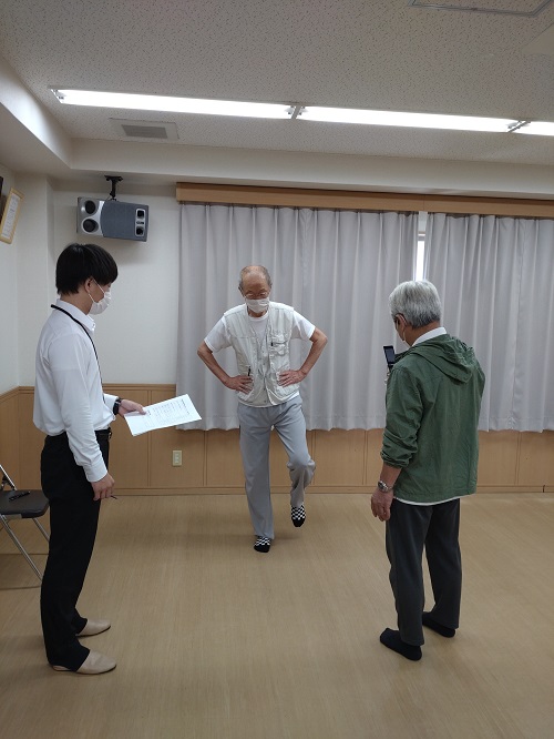 椅子から立ち3メートルの範囲まで歩き元の椅子まで戻る測定と片足立ちの二つの項目を取り組んでいただきました。