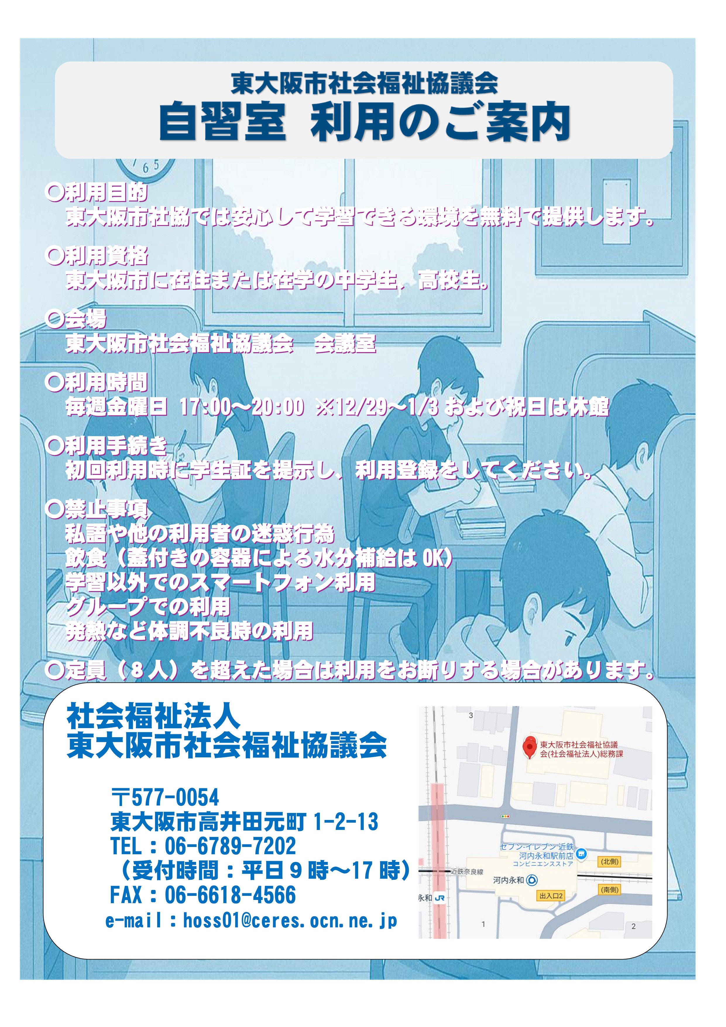 東大阪市社協では安心して学習できる環境を無料で提供します。